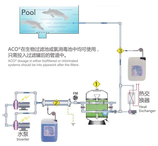 在动物系统中,ACO®最好是在AFM过滤后,通过计量泵持续添加。投加量根据系统的负荷量确定,范围在0.5 - 1.0ml每立方米过滤量之间。